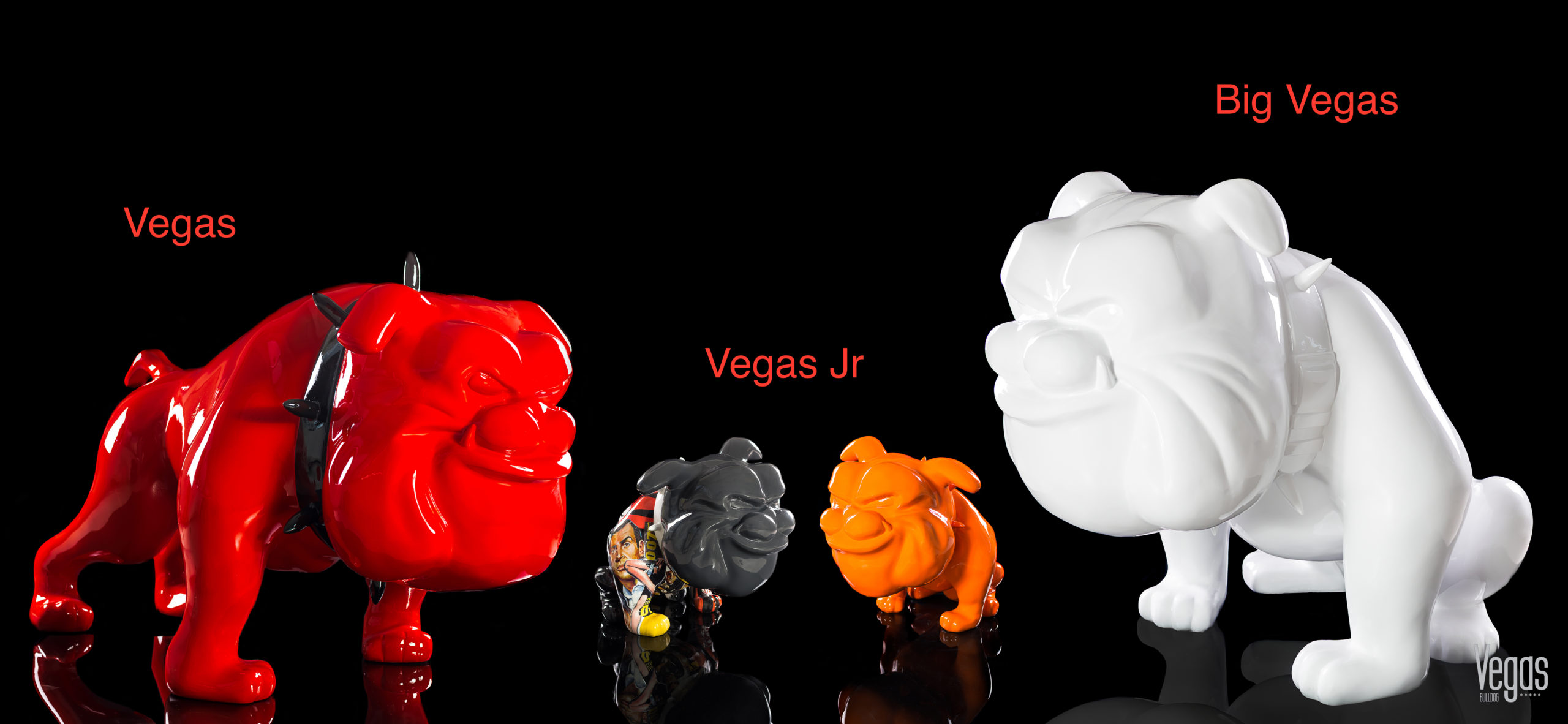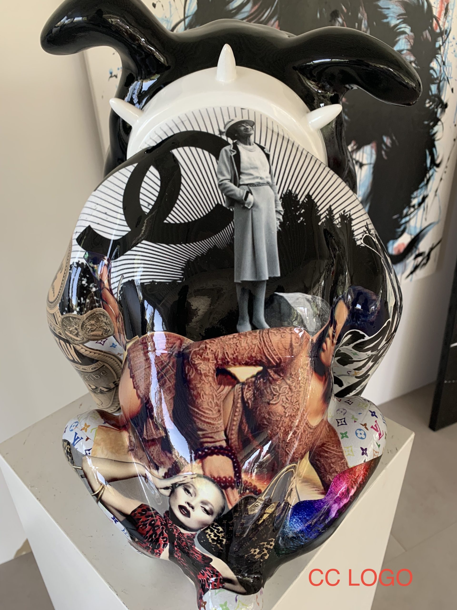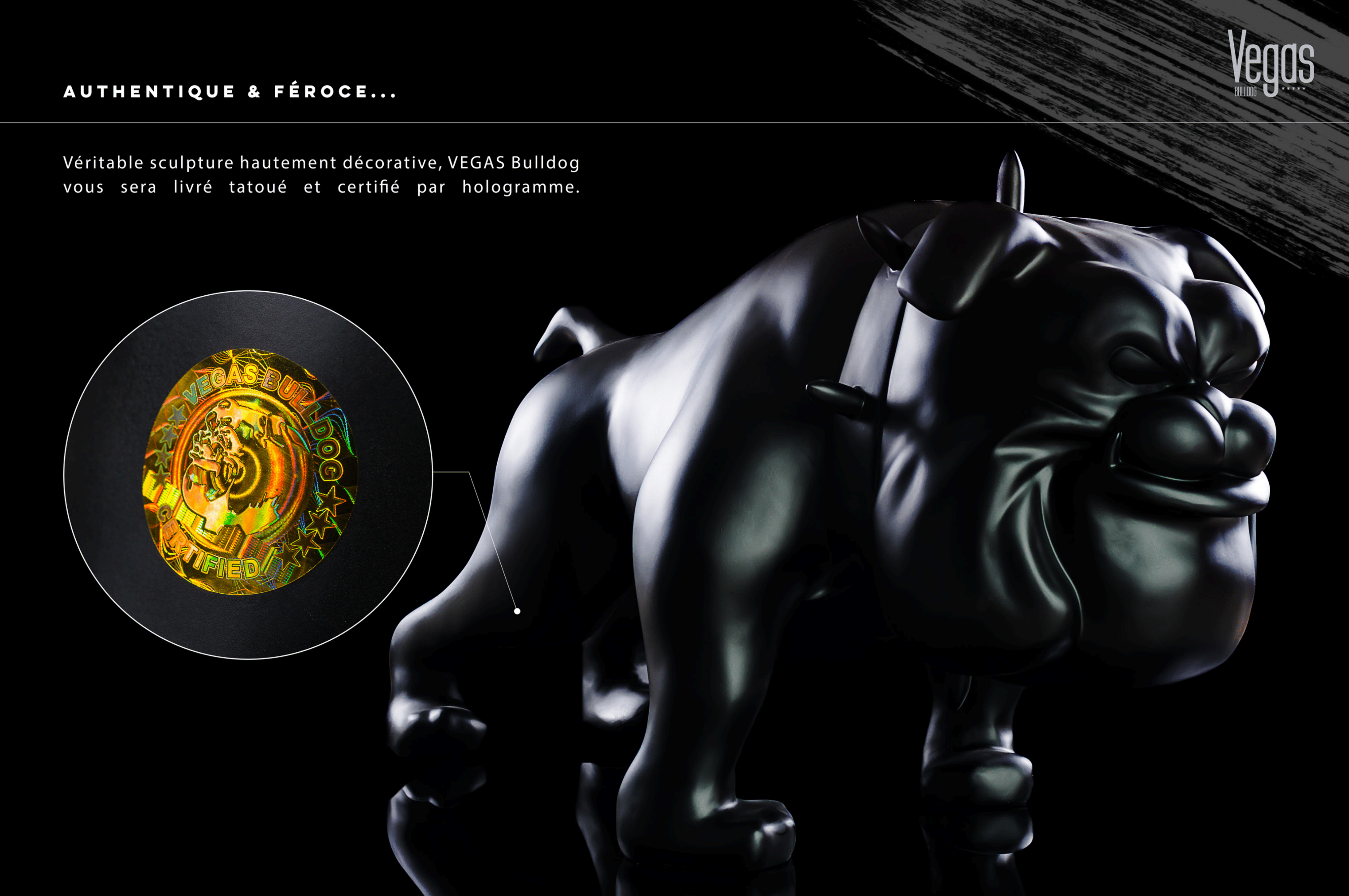 Véritable Œuvre d’art, le Vegas Bulldogs Signé Christophe Comerro est une sculpture en résine vinyle de finition vernis laqué travaillé en patchwork de style à partir d’image iconographique, de figures emblématiques du cinéma, et des plus grandes marques.
