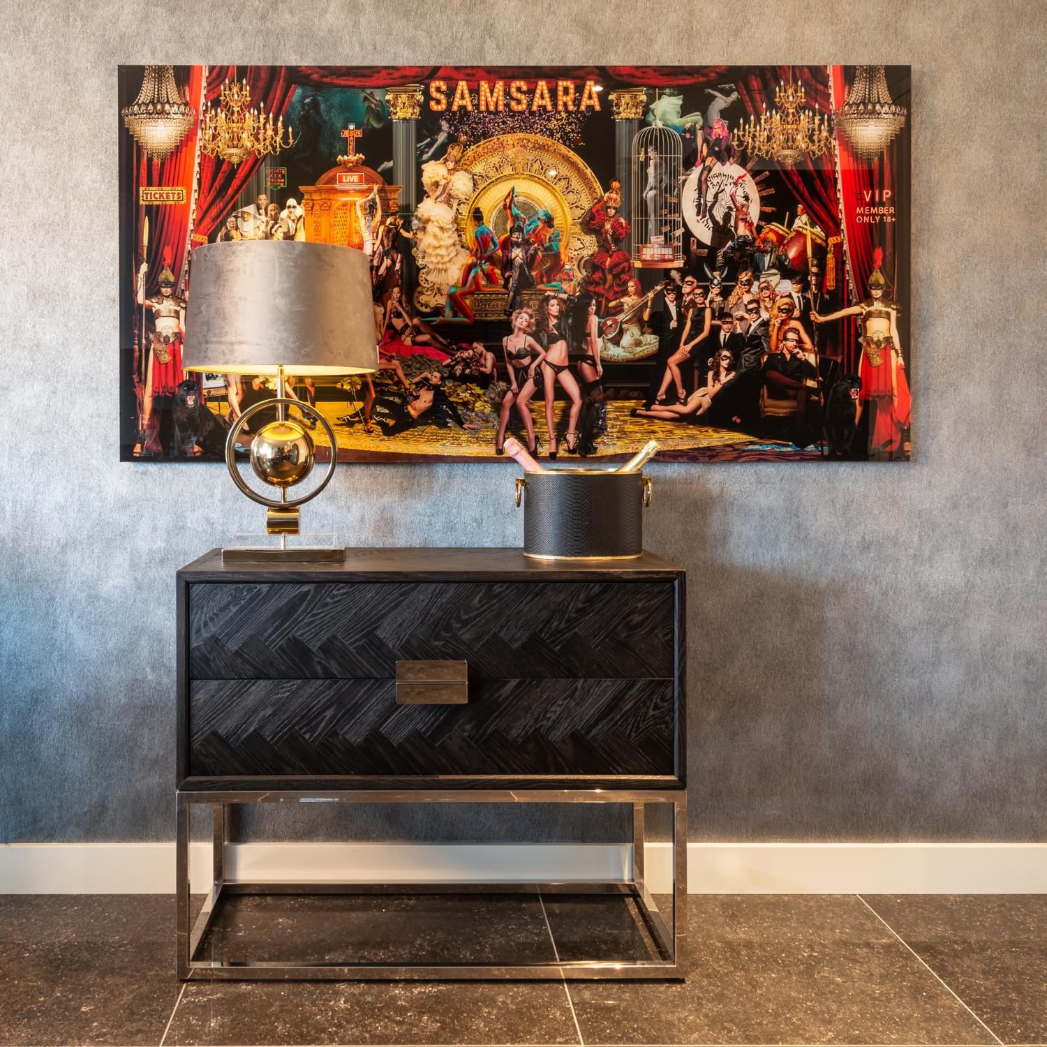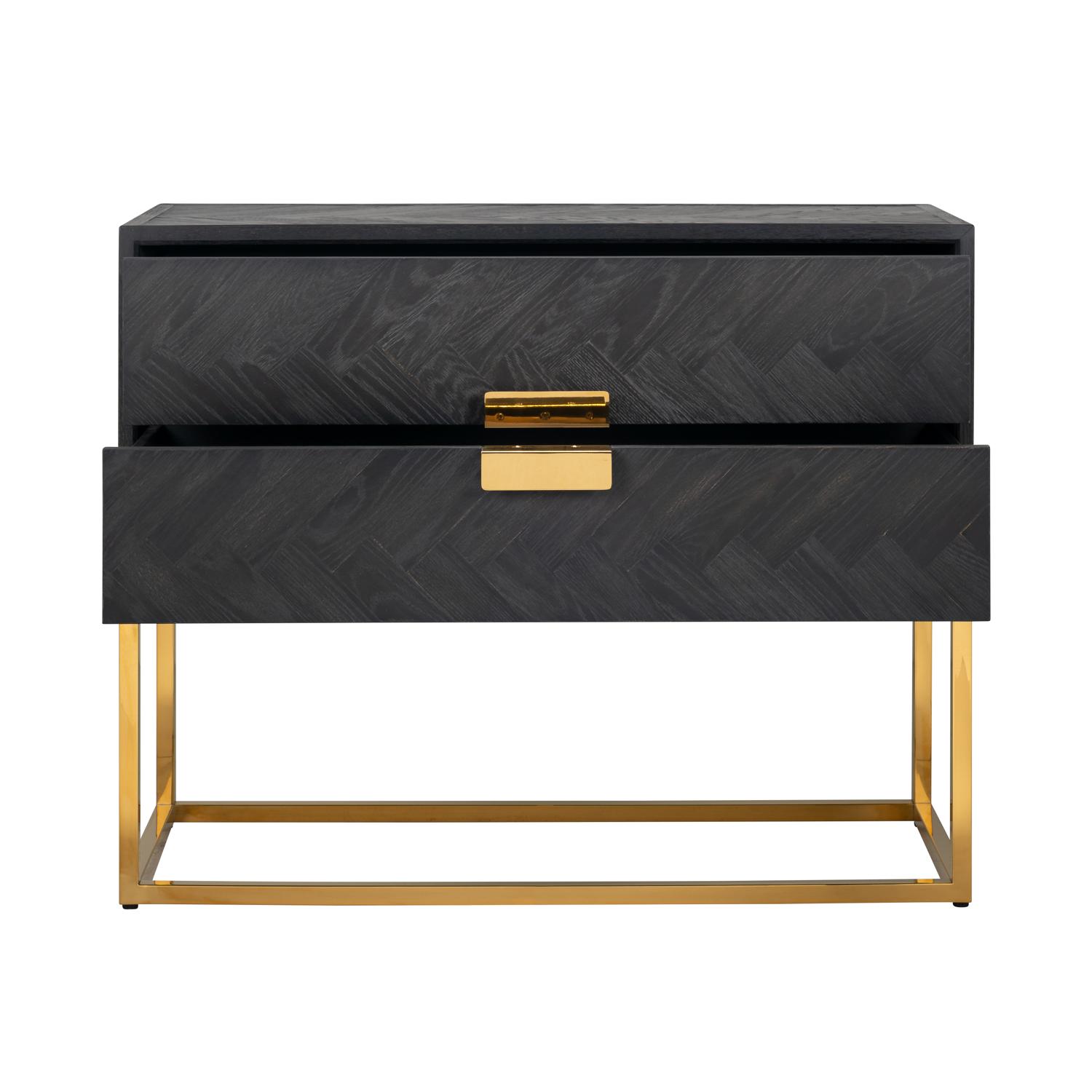 La collection Blackbone Gold estcomposée de chêne contreplaqué teinté noir, placédans un modèle de chevrons. Le cadre en métal doré vous donnera une ambiance chic.Possibilités: Cette collection est composée d’unetable de salle à manger extensible avec rallonges(entre 180 et 255 cm), d’une console, de 2 différentestables de salons (rectangulaire et carrée), d’une tabled’appoint, d’un meuble TV, d’une table d’angle et de 2armoires.La collection complète est également disponible avec un cadre en métal argenté : la collection Blackbone Silver.Entretien:Il est important d’entretenir vos meublesBlackbone Gold pour les garder beaux, comme vous le feriez avec d’autres de vos objets précieux.Retirez les tches immédiatement : mais ne frottez pas, tamponnez les avec une serviette en papier ou un chiffon absorbant. n’utilisez ou n’appliquez aucun produit d’entretien contenant du silicone ou des solvants comme : les détachants, l’essence de térébenthine ou les diluants. Les tches peuvent êtreretirées avec de l’eau et du savon naturel si nécessaire.Faites attention avec les produits d’entretien contenantdes additifs de blanchiment (citron par exemple). Les produits de nettoyage abrasifs ne doivent jamais être utilisés.Le cadre peut être nettoyé avec un chiffon doux et humide si nécessaire.n’utilisez jamais d’éponges ou de détergents abrasifs car cela pourrait laisser des rayures sur la couche de laque.De cette façon, vous garderez vos meubles brillants et ils dureront éternellement.