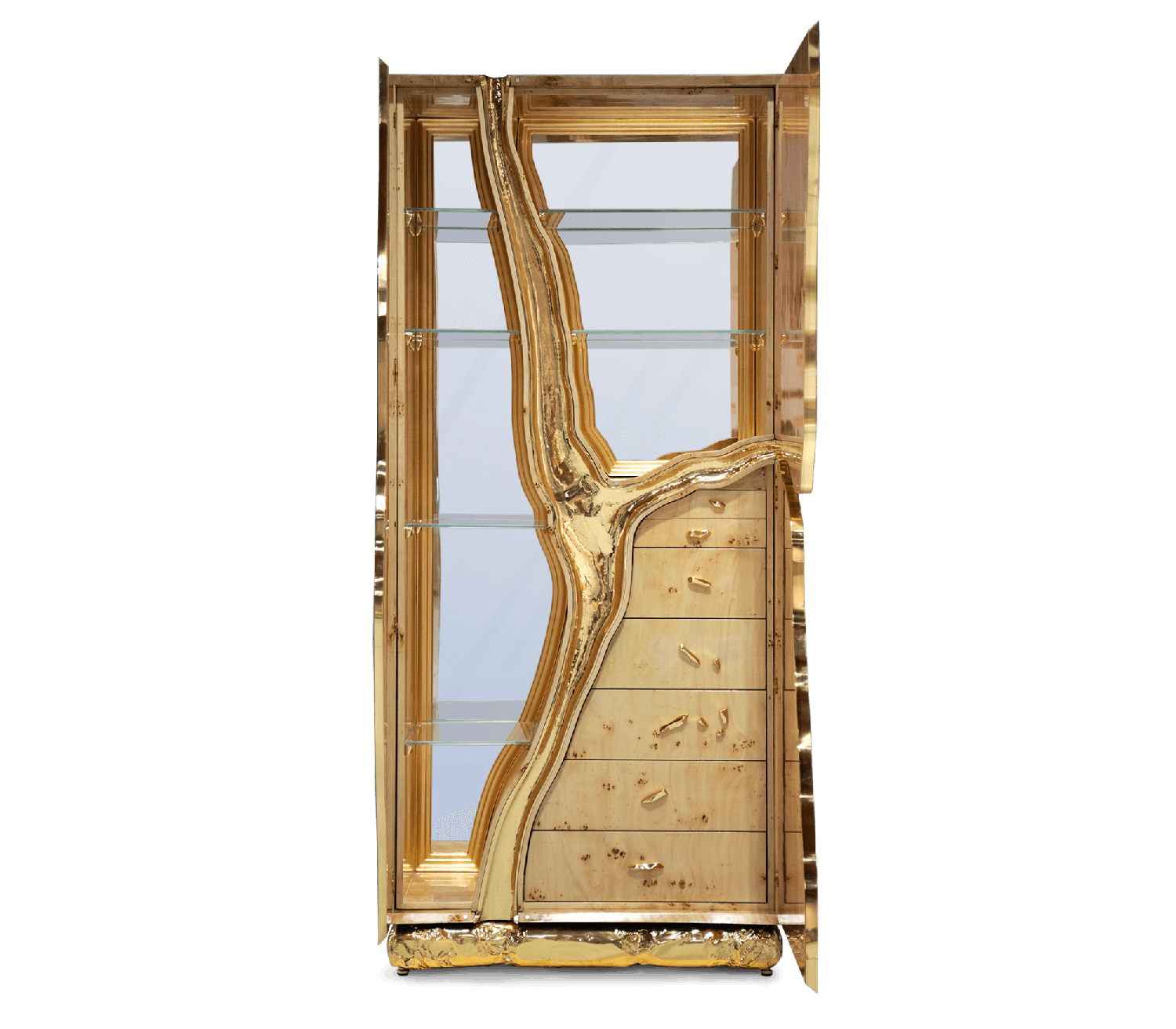 L’armoire Lapiaz s’inspire des motifs créés sur le calcaire ou la roche dolomitique en raison des températures glaciales. Tout comme ce phénomène géologique, le cabinet Lapiaz est divisé en une forme unique, révélant un intérieur riche et séduisant. Produit en utilisant les meilleurs placages, feuilles d’or et miroirs coupés à la main, le Lapiaz apporte un caractère audacieux à n’importe quel intérieur, tout en conservant une posture raffinée et élégante.
