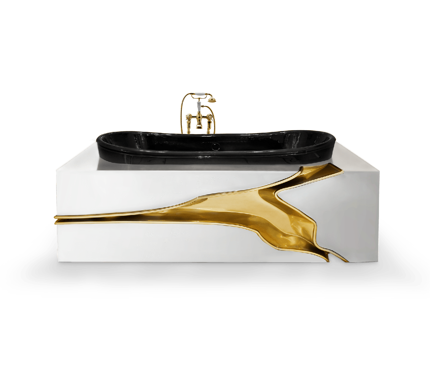 Structure: fibre de verre laquée noire à haute brillance avec une feuille d’acier inoxydable; Baignoire: fonte laquée noire brillante; Déchirure: Larmes peintes en or avec vernis brillant; Drainage: sol DIMENSIONS