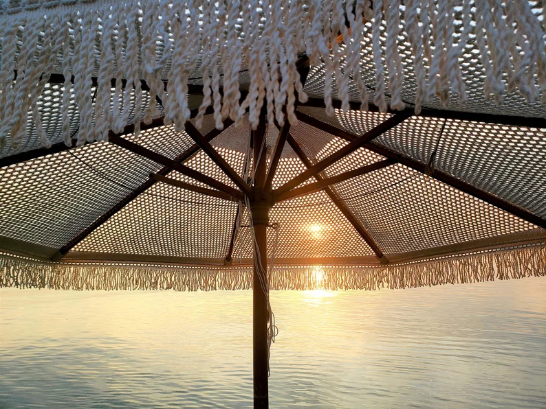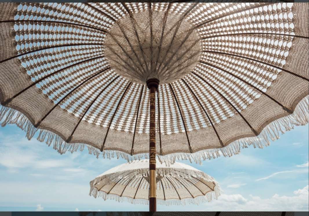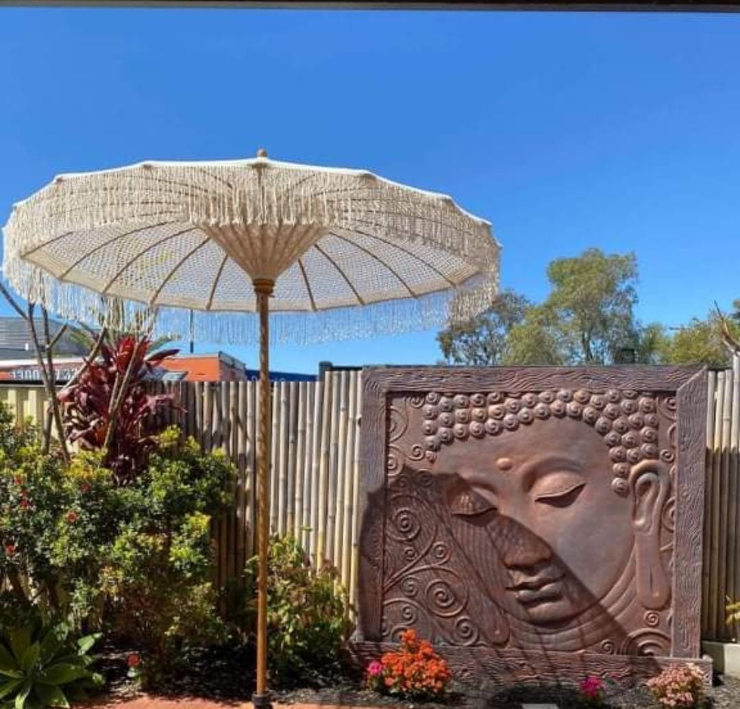 Amener la culture balinaise, empreinte de sérénité à votre jardin avec cette ombrelle en teck et macramé coton écru. Craquez pour sa toile en macramé. Son manche en teck avec des parties sculptées dorées rajoutera une touche exotique chic à l’ensemble. Fournis avec un pied original sculpter au motif d’UBUD en ciment naturel.