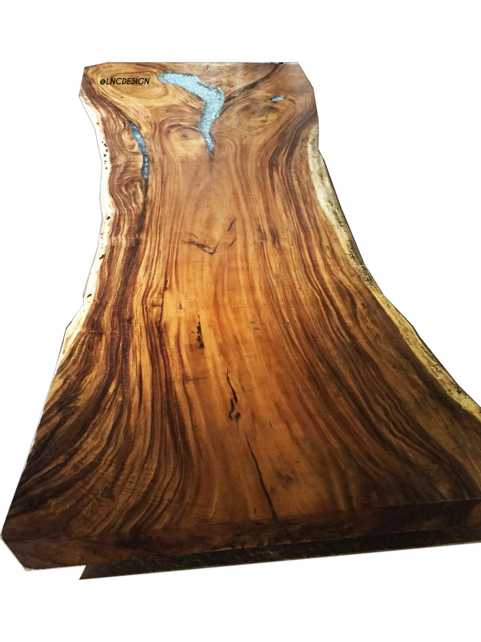 Topaz en bois de forme organique,¬composé de matières nobles telles que le bois,¬En véritable¬bois de suar¬incrusté de résine époxy bleu, elle mesure 300cm avec un piètement métallique noir mat, unique pièce.