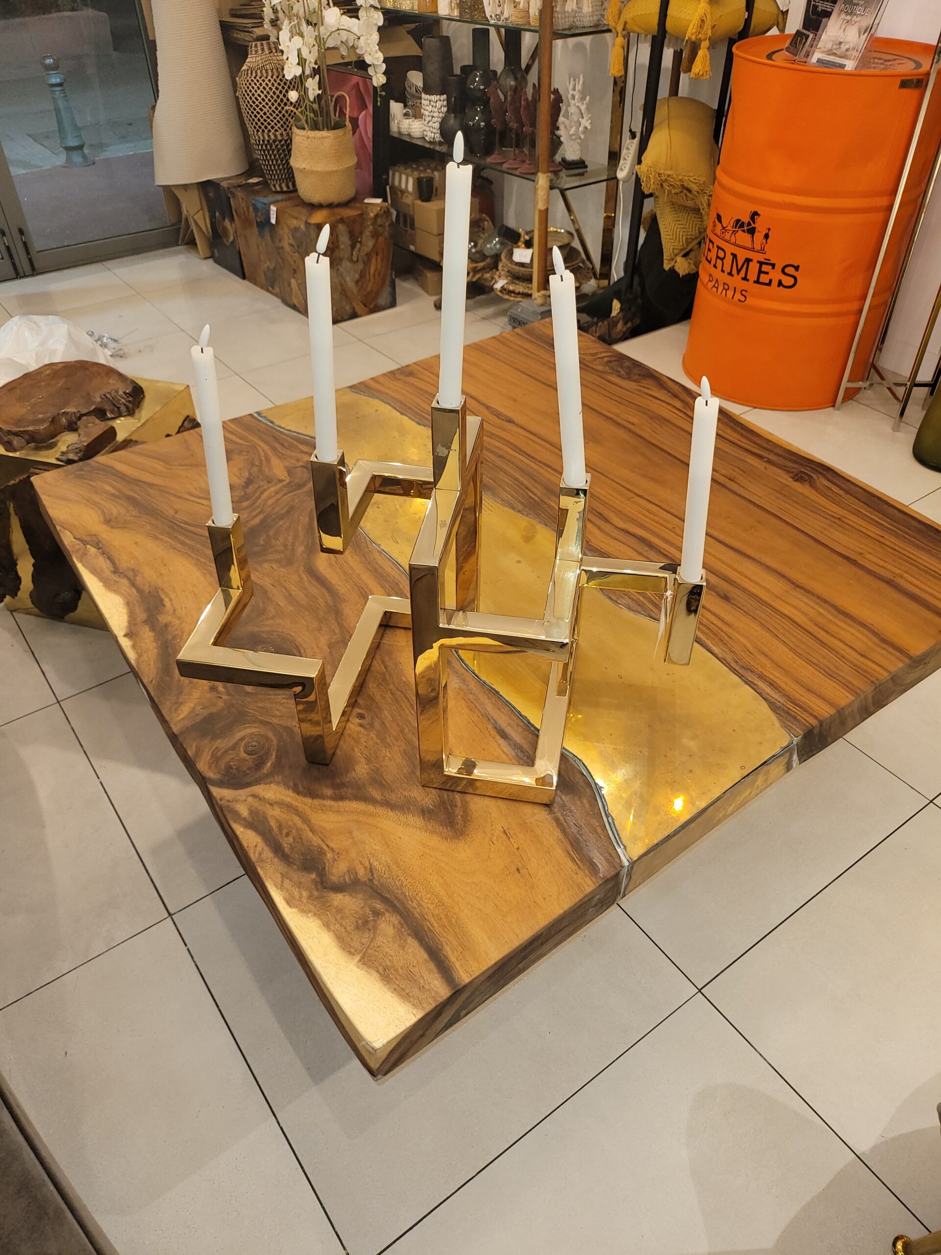 Les produits de la grande distribution ne vous contentent pas ? Vous voulez que votre Intérieur ne ressemble qu’à vous ? Vous recherchez des objets rares, esthétiques et de qualité ? La gamme Signature, que j’ai moi-même imaginée et dessinée est l’alliance de matériaux intemporels et chaleureux. Vous retrouverez des matières nobles telles que le bois, la résine, le verre ou encore le métal.Partie d’une volonté de casser les codes j’ai imaginé des produits uniques ne pouvant être reproduits à l’identique de par l’origine de leurs composants. En effet, nous utilisons du bois brut soigneusement sélectionné sur l’île de Java en Indonésie et le travaillons artisanalement dans nos ateliers à Bali. Nos installations nous permettent aussi de répondre à des demandes plus précises : vous avez la possibilité de nous soumettre des idées que vous avez personnellement imaginées et créés. Toutes les demandes, même les plus excentriques sont les bienvenues. Ainsi La Collection Signature, Sophistiquée et éclectique fera toute la différence dans votre intérieur ! Table basse en bois avec insert en laiton or et pied or. Assorti à la table à dîner La série Oziria est tout ce qu’il y a de plus luxueux !