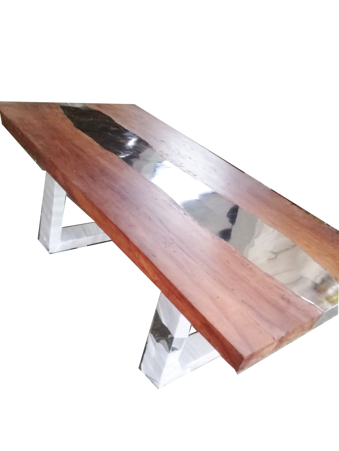 Les produits de la grande distribution ne vous contentent pas ? Vous voulez que votre Intérieur ne ressemble qu’à vous ? Vous recherchez des objets rares, esthétiques et de qualité ? La gamme Signature, que j’ai moi-même imaginée et dessinée est l’alliance de matériaux intemporels et chaleureux. Vous retrouverez des matières nobles telles que le bois, la résine, le verre ou encore le métal. Partie d’une volonté de casser les codes j’ai imaginé des produits uniques ne pouvant être reproduits à l’identique de par l’origine de leurs composants. En effet, nous utilisons du bois brut soigneusement sélectionné sur l’île de Java en Indonésie et le travaillons artisanalement dans nos ateliers à Bali. Nos installations nous permettent aussi de répondre à des demandes plus précises : vous avez la possibilité de nous soumettre des idées que vous avez personnellement imaginées et créés. Toutes les demandes, même les plus excentriques sont les bienvenues. Ainsi La Collection Signature, Sophistiquée et éclectique fera toute la différence dans votre intérieur ! Table basse en bois naturel avec une bande au milieu brillante inoxydable, avec les pieds en métal inoxydable mesurant 100X70X45 cm